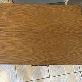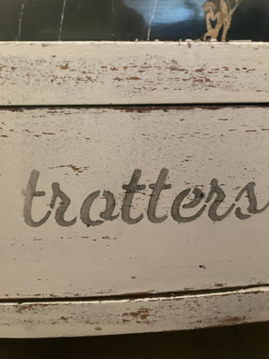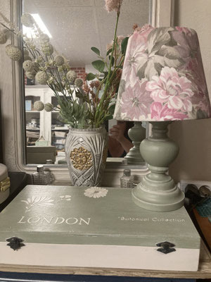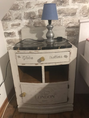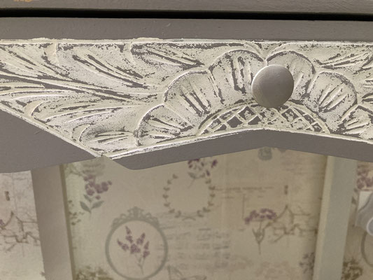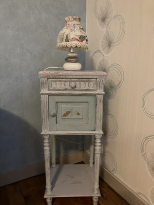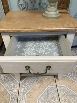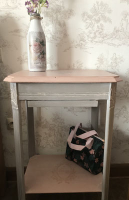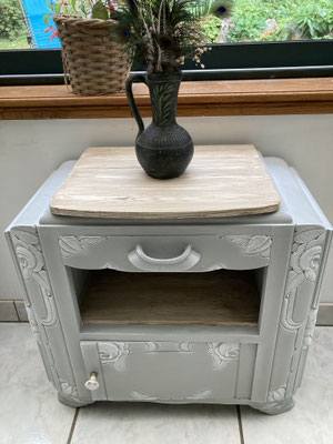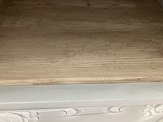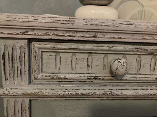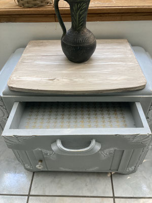 Le plateau a été poncé pour gommer le vernis et donner un aspect plus naturel au bois. Ponçage du plateau et Afin de le protéger, le produit fond dur a été appliqué en deux couches. Sur le corps du meuble, peinture mat sans sous couche de couleur Soie Sauvage et Vert de Gris. Légère patine béton sur le tiroir et dans le fond, pose d’un papier peint.