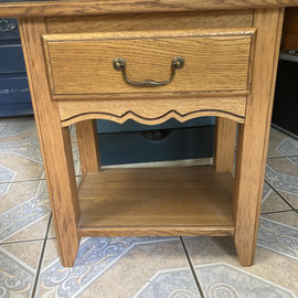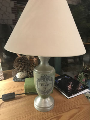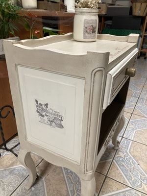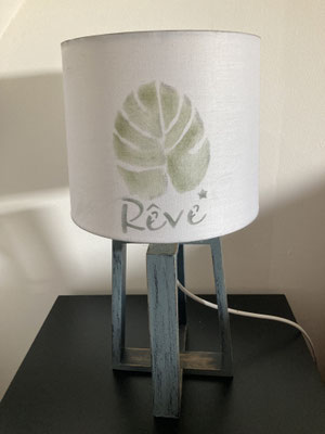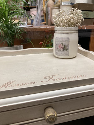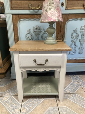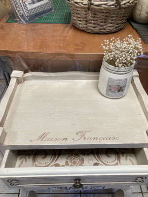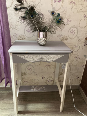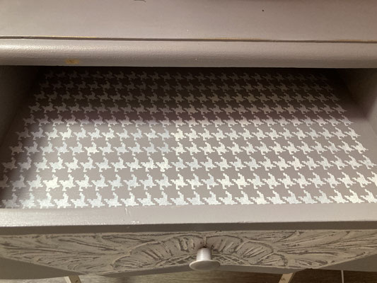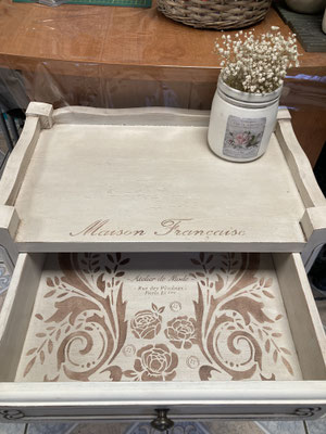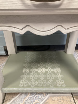 Produits utilisés : Peintures Mat Réglisse et Calcaire. Pochoir Nids d’Abeille. Plateau : Sensation bois Chêne clair. Fondur. Produits de chez Eléonore Déco.